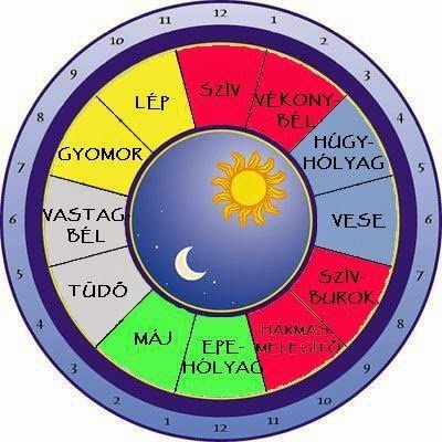 13-15 óra között: lassul a vérkeringés, az energiák a vékonybélben koncentrálódnak, csökken a fájdalomérzékelés is, ezért ilyenkor érdemes a fogorvoshoz bejelentkezni. A vékonybél az immunrendszer legfontosabb része, ezért a frissen készült meleg ebéd alapvetően hozzájárul az immunrendszer karbantartásához.